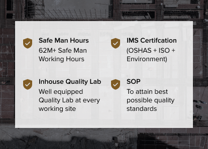 When it comes to building infrastructure, keeping a check on the safety of personnel and the quality of work & materials being delivered becomes a priority. With over 62 Million safe man working hours and an IMS Certification, we also have well equipped inhouse Quality Lab.